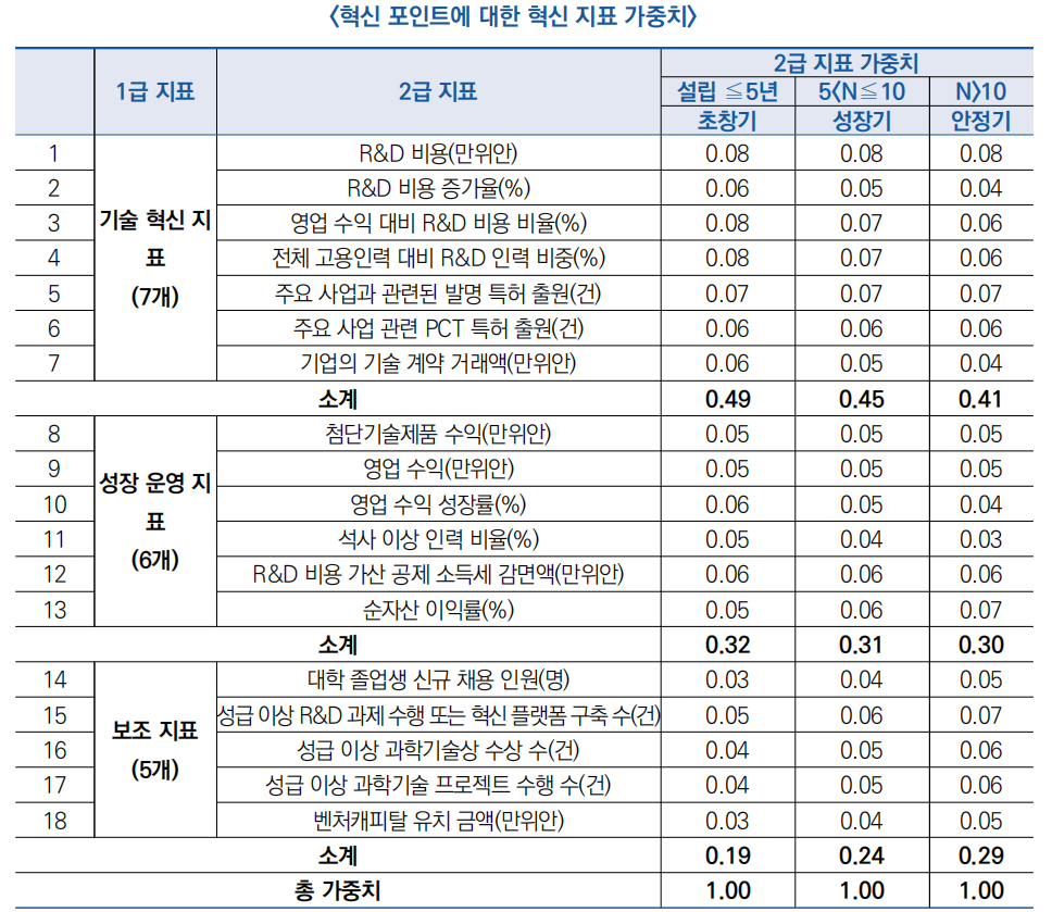 - (성장 경영 지표) 기업의 지속 가능한 성장 능력을 평가하며 첨단기술 제품 매출, 매출 증가율, 고학력 인재 비중, 연구개발 세액 공제 혜택 등 6개의 지표로 구성됨