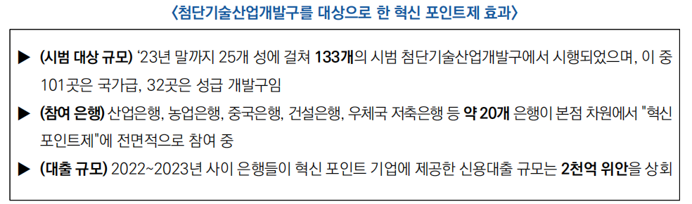 □ 과기부는 이에 앞서 첨단기술산업개발구를 대상으로 ‘혁신 포인트제’ 대출 지원 정책(′20. 12월)과 과기혁신 재대출 지원 정책(′24.4월)을 시범적으로 추진한바 있음