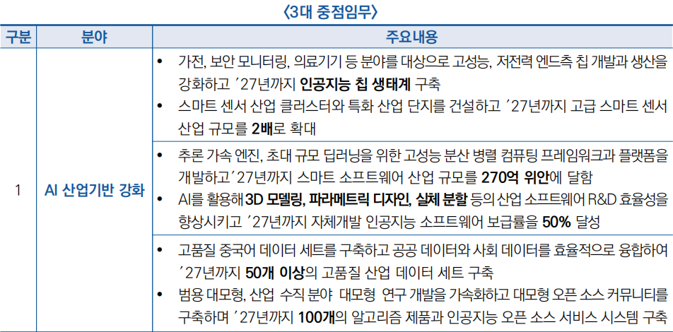- ′27년까지 컴퓨팅 규모 60EFLOPS를 초과하고 핸드폰, 컴퓨터, 가전, 로봇 등 8대 분야에서 100개 종류 이상의 스마트 단말기를 개발하고 인공지능 핵심산업 규모를 4,400억 위안(83조 8,904억 원)이상으로 확대