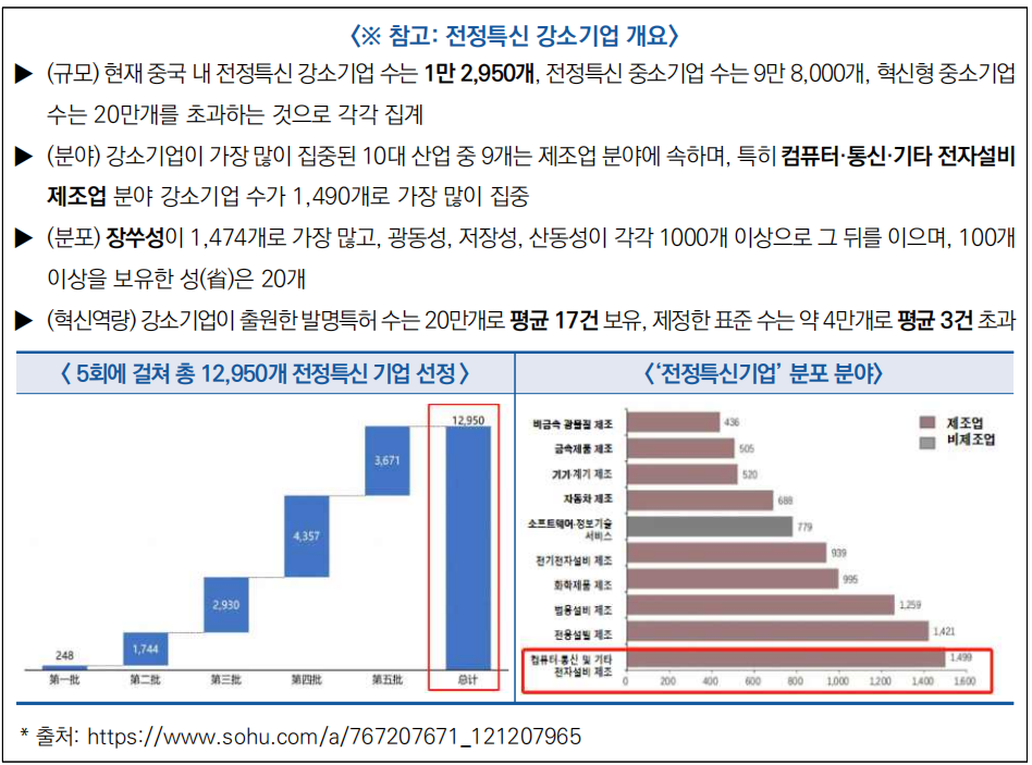 * ′19년부터 중국 정부는 5차례 총 12,950개의 ‘전정특신’ 강소기업을 선정했으며 주로 컴퓨터, 통신 및 전자장비제조업, 전용장비제조업, 일반장비제조업 등 분야에 집중