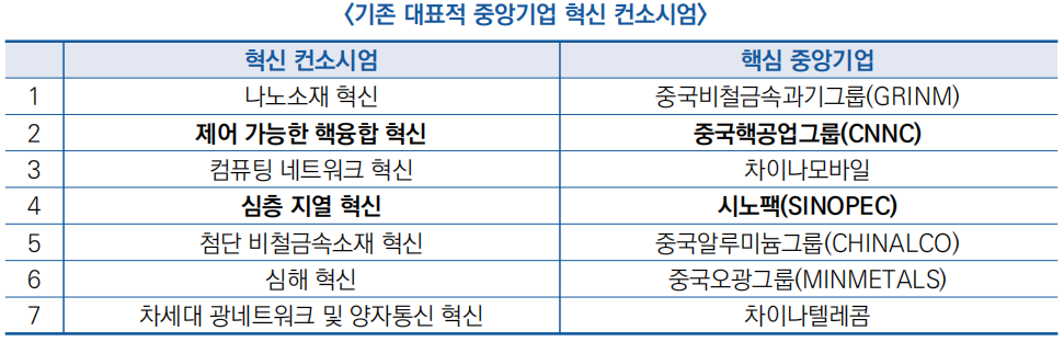 ○ 대표적 중앙기업 혁신 컨소시엄으로는 심층 지열 혁신, 나노소재 혁신, 차세대 광네트워크 및 양자통신 혁신 등 컨소시엄 해당