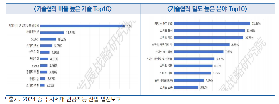 - 기술 협력 밀도 높은 분야로 보면 기업 스마트 관리는 11.83%로 1위를 차지하고 스마트 도시(11.01%)와 스마트 제조(10.75%)는 각각 2~3위 차지