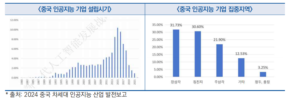 ○ 중국의 인공지능 기업은 주로 장강삼각주(31.73%), 징진지(30.6%)와 주강삼각주(21.9%) 등 3대 지역에 집중