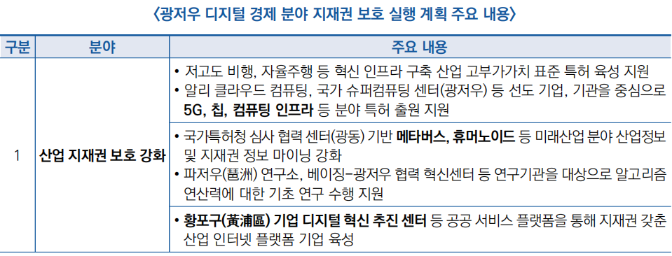 ○ 광저우 개발구 인민정부는 디지털 산업화를 촉진하기 위해 ‘디지털 경제 지재권 보호 실행 계획’을 발표하여 산업 지재권 보호 강화 등 5대 분야 총 20개 구체적 업무를 제시