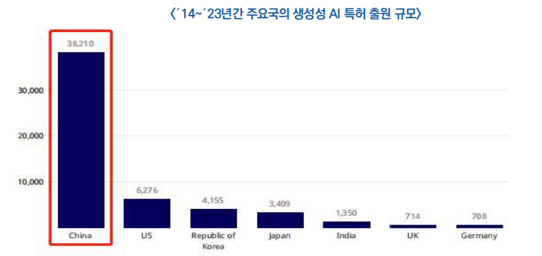 - 중국은 지난 10년간 생성형 AI 관련 특허 출원 규모가 3만 8,000건을 넘어섰는데, 이는 같은 기간 미국(6,276건)의 약 6배 수준