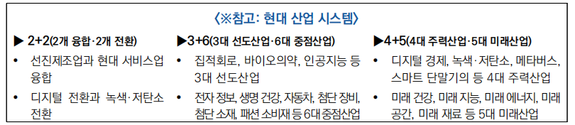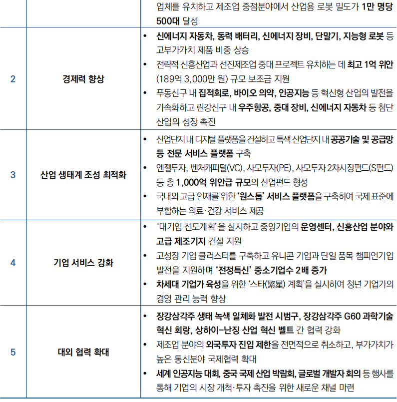 - (′27년) ‘(2+2)+(3+6)+(4+5)’ 현대 산업 시스템을 마련하고,산업 총 생산액은 5만 억위안 달성, 3대 선도산업 규모 연평균 10% 이상 성장