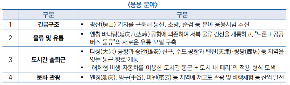 - (응용 분야) 긴급구조, 물류 및 유통, 도시간 출퇴근 등 다양한 응용 시나리오 개발