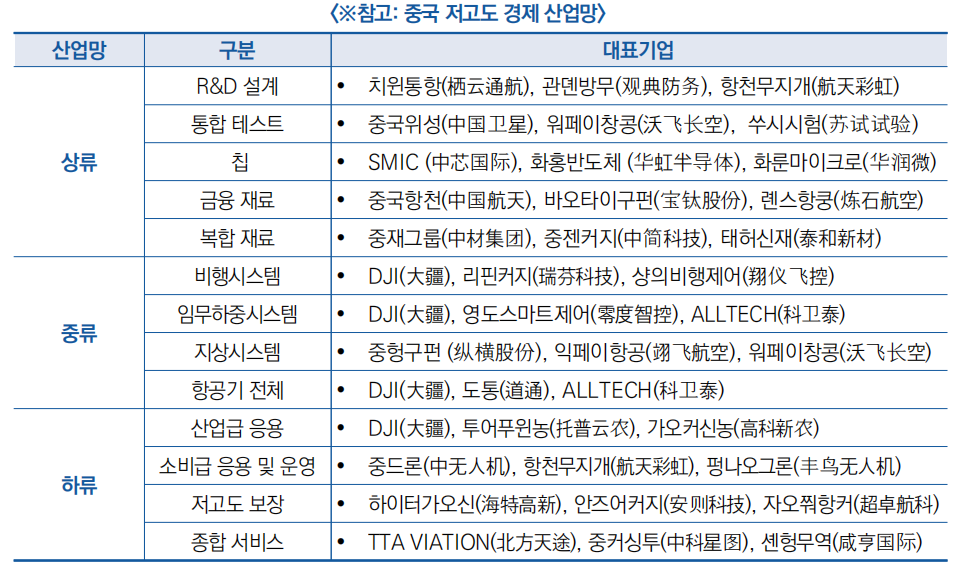 ![]() ○ 중국 저고도 경제 산업망은 상류(R&D 설계, 원자재), 중류(부품제조, 통합),하류(응용, 서비스)산업으로 구성하고 그중 상·중류 연구개발과 제조단계의 기술 진입장벽이 비교적 높은 편임