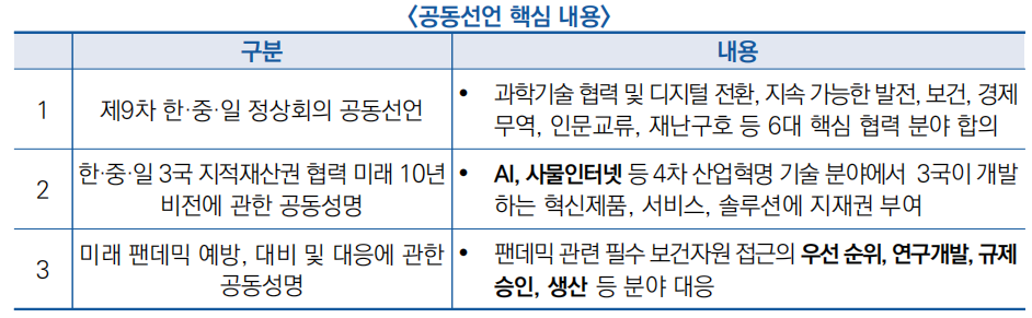 - 3국은 ‘제9차 한·중·일 정상회의 공동선언’, ‘한·중·일 3국 지적재산권 협력 미래 10년 비전에 관한 공동성명’, ‘미래 팬데믹 예방, 대비 및 대응에 관한 공동성명’을 발표