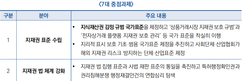 □ 지재권 표준 수립, 지재권 법 체계 강화 등 7대 분야의 중점과제를 공개(5.29)