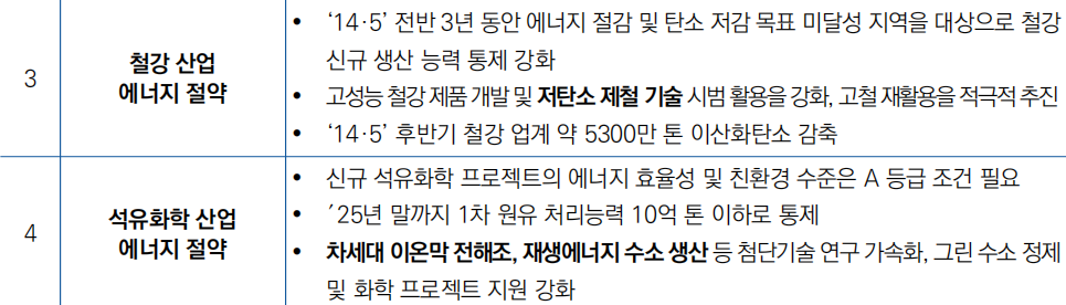 ○ ‘14차 5개년 계획’ 에너지 절약 및 탄소 저감 구속 목표 달성을 목표로 에너지 소비, 철강, 석유화학, 건자재, 교통 등 10대 시범 분야를 선정