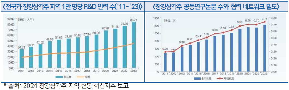 - 강장삼각주 R&D인력(전일제 환산·FTE 기준) 규모는 2011년의 73.84만 명에서 2023년 198.35만 명으로 급증하여 중국 전체의 약 31.22% 차지
