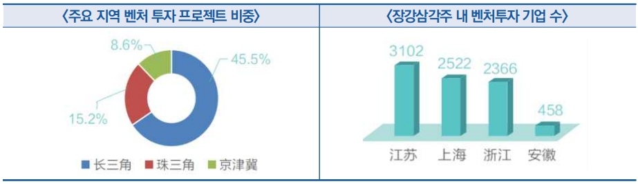 - 장강삼각주 지역은 중국 내 벤처투자가 가장 활발한 지역으로 ′22년 해당 지역에 투자하는 프로젝트 비중은 45.5%에 달함