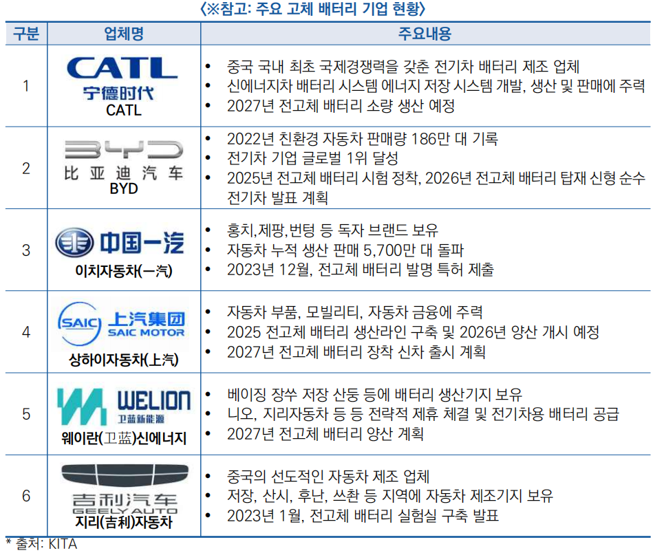 ○ 중국 정부는 60억 위안(약 1조 원)을 투자해 CATL, BYD 등 6개 기업의 전고체 배터리 기초연구를 지원할 예정
