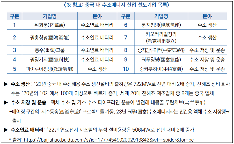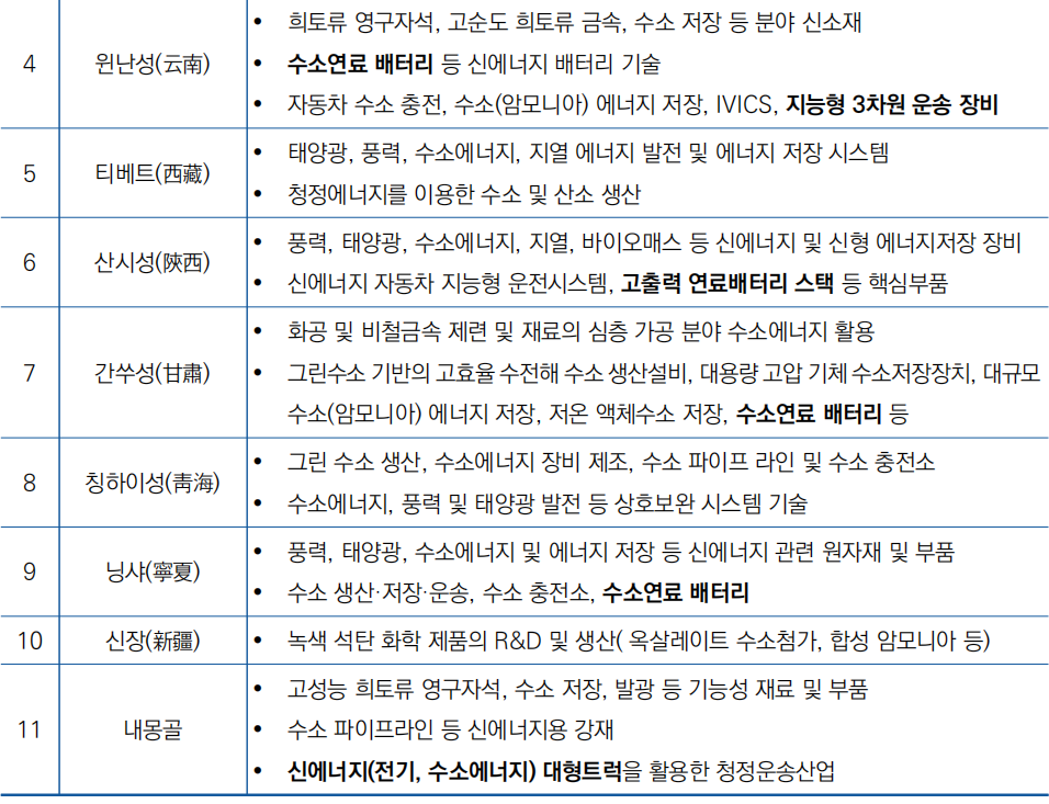 ○ 윈난, 산시, 닝샤, 간쑤 등 지역은 수소연료 배터리 개발 분야에 집중하고, 충칭, 내몽골 등 지역은 수소 자동차 생산 등에 특화할 계획임