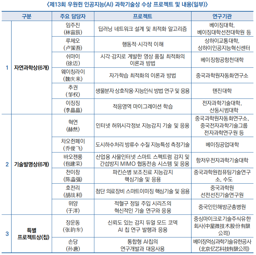 □ 중국 인공지능(AI) 분야의 발전과 산업화에 기여한 70개 프로젝트 및 개인 수상자를 발표(4.15)
