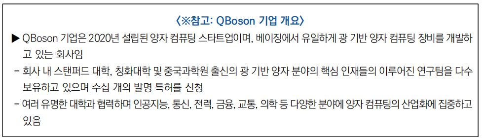 ○ 중국 양자 컴퓨팅 기업 QBoson은 2024년 베이징 왕징에서 주최한 신제품 컨퍼런스에서 550 광자 기반 양자컴퓨터를 공개