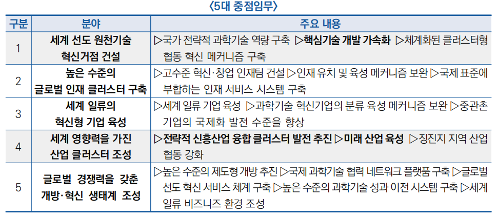 ○ 주요 내용으로 세계 선도 원천기술 혁신거점 구축, 높은 수준의 글로벌 인재 클러스터 건설, 세계 일류의 혁신형 기업 육성 등 5대 중점임무를 제시