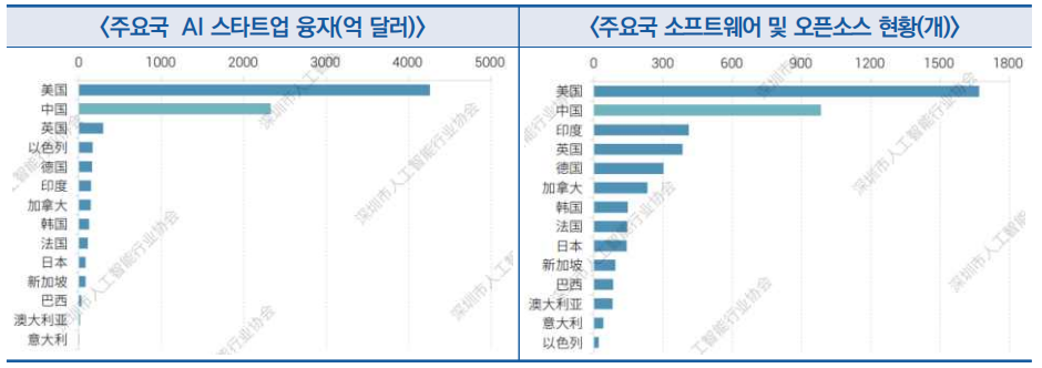 ![]() ○ ′23년, 중국 AI 스타트업의 리스크 융자액은 세계 2위(2,333억 5천만 달러)이며, 오픈소스 현황도 미국 다음임