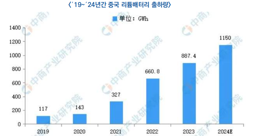- ′23년 한해 중국의 리튬배터리 출하량은 887.4GWh(34.3%↑)로 전 세계의 73.8%를 차지하였으며, ′24년에는 1000GWh를 초과할 것으로 전망