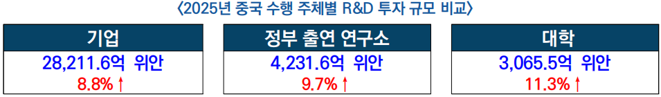 - 중국 기업, 정부 출연 연구소, 대학 R&D 투자는 각각 28,211.6억 위안(555조 350억 원), 4,231.6억 위안(83조 2,524억), 3,065.5억 위안(60조 3,106억 원)으로 전년 대비 각각 8.8%, 9.7%, 11.3% 증가