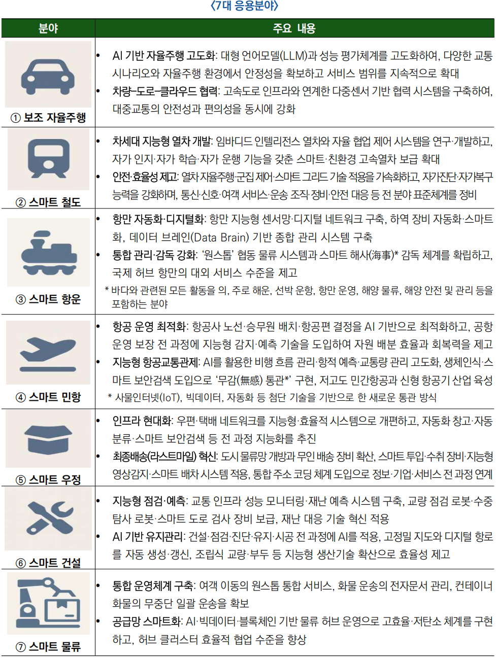 □ (주요내용) 이번 정책은 교통 분야 기술개발–제품혁신–대형 언어 모델(LLM) 구축을 중심으로 추진하며, 2027년까지 시범사업 구축, 2030년까지 상용화를 목표로 설정