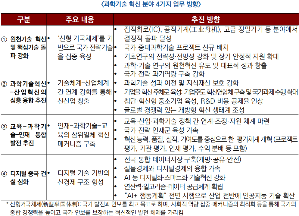 ![]() □ (과학기술 혁신) 이번에 특히 과학기술 분야는 우주강국 구축, 신질적 생산력 육성, 원천기술 혁신 및 핵심기술 돌파 등 세부 추진 방향을 제시