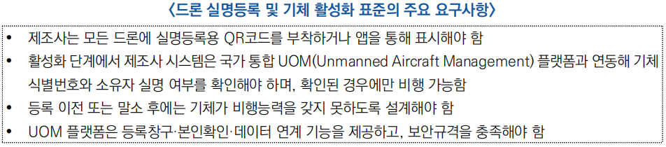 ○ (표준 1: 실명등록·기체 활성화) 드론 소유자 확인과 미등록 기체의 비행 차단을 제도화함