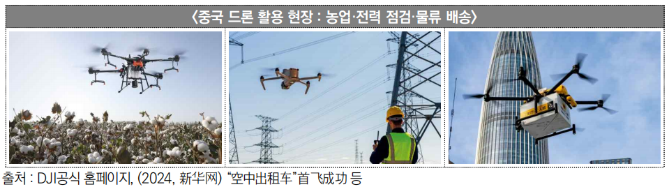 ![]() ○ (정책) 중국은 기존 ‘드론 비행관리 임시조례(23.05/국무원)’·‘민용 드론 안전 관리 규칙(23.12/교통운송부)’에서 실명등록과 운항안전 원칙을 제시하였으나, 표준화된 기술규격과 검증 기준이 부재해 지역별 관리가 단절되고 규제 공백이 지속됨