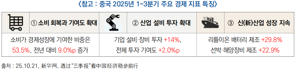 * 2025년 1~3분기 중국 GDP는 101조 5,036억 위안(약 2경 1,175조 원), 성장률은 5.2%로 지난해보다 속도가 조금 빨라졌으며, 3분기도 전기 대비 1.1% 증가해 정부는 경제가 ‘안정적으로 개선되는 흐름’이라고 평가