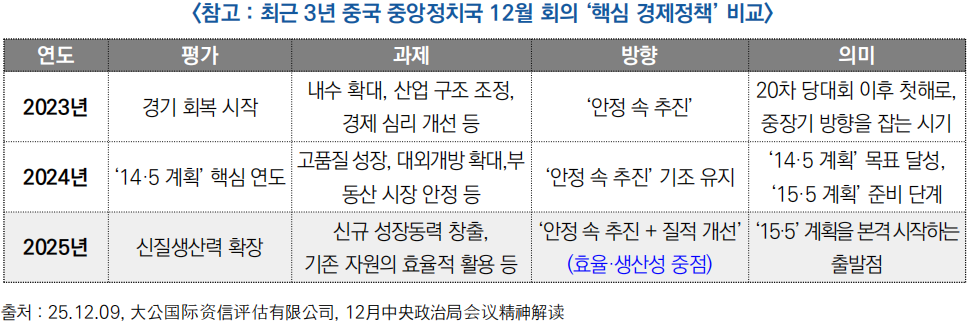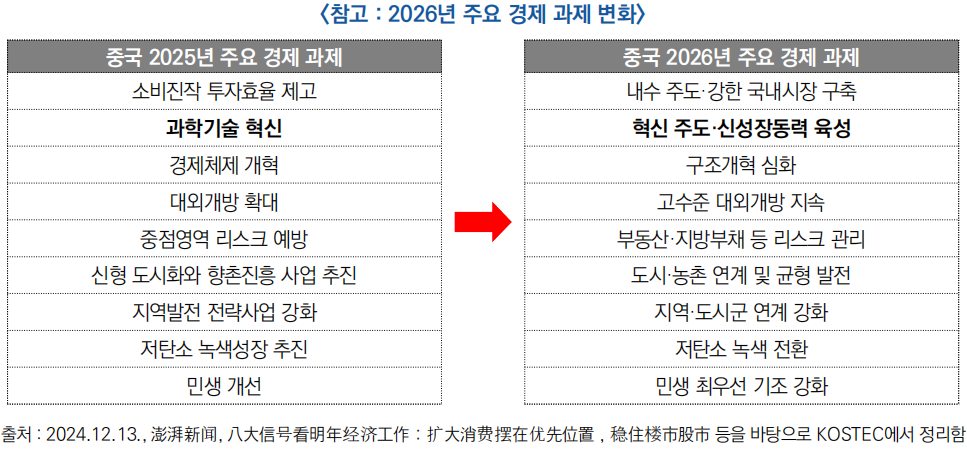 ![]() □ 정치국 회의 이후 개최된 중앙경제업무회의(12.10~11)는 2026년 경제운영을 위한 보다 구체적인 실행 과제를 제시(25.12.12)