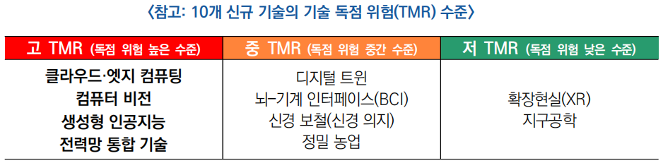 - 이 가운데 ▲클라우드·엣지 컴퓨팅, ▲컴퓨터 비전, ▲생성형 인공지능, ▲전력망 통합 기술 등 4개 기술은 ‘고 기술 독점 위험(TMR)’ 분야로 평가되었으며, 이는 해당 영역에서 중국 기관의 전문성과 연구 역량이 고도로 집중되어 있음을 의미함