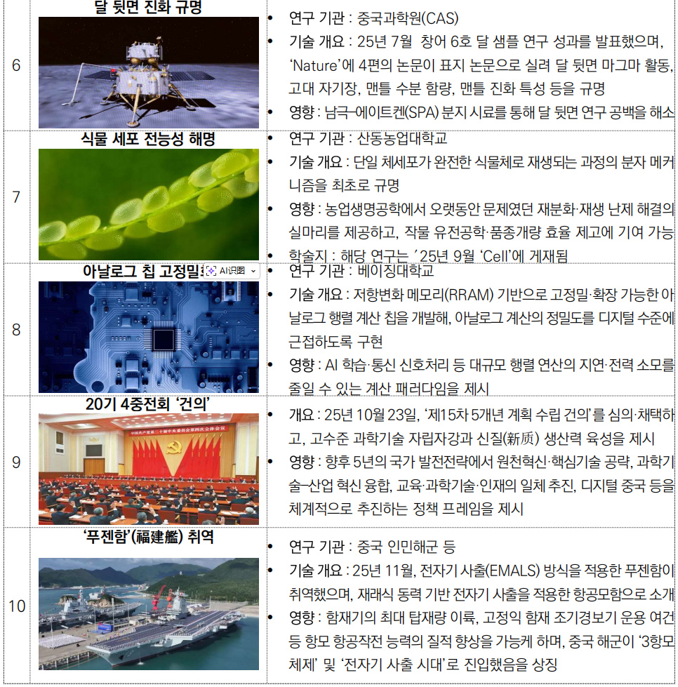 □ 과기일보는 중국 과학기술 분야 대표 언론으로 양원(중국과학원&중국공정원) 원사와 주요 언론 책임자 공동 평가를 통해 ‘2025년 중국 10대 과학기술 이슈’를 선정·발표(25.12.25)