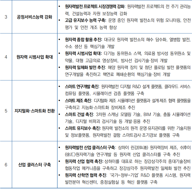 - 10개 국가급 원자력발전산업혁신센터, 15개 스마트제조 시범공장을 건설하고 3~5개 국제기구와 외자기업 본부 유치