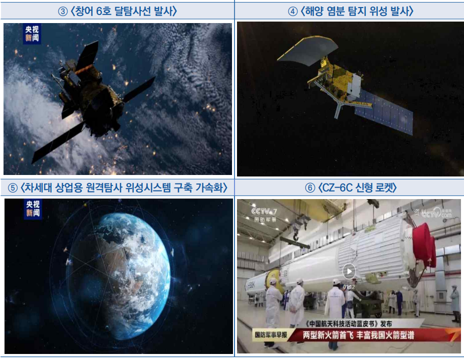 - 차세대 지구저궤도 유인우주선, 창어 7호 달 탐사선, 톈원(天問) 2호 화성 탐사선, 정지궤도 마이크로파 탐사위성 등 200여개의 우주설비 개발 사업을 추진
