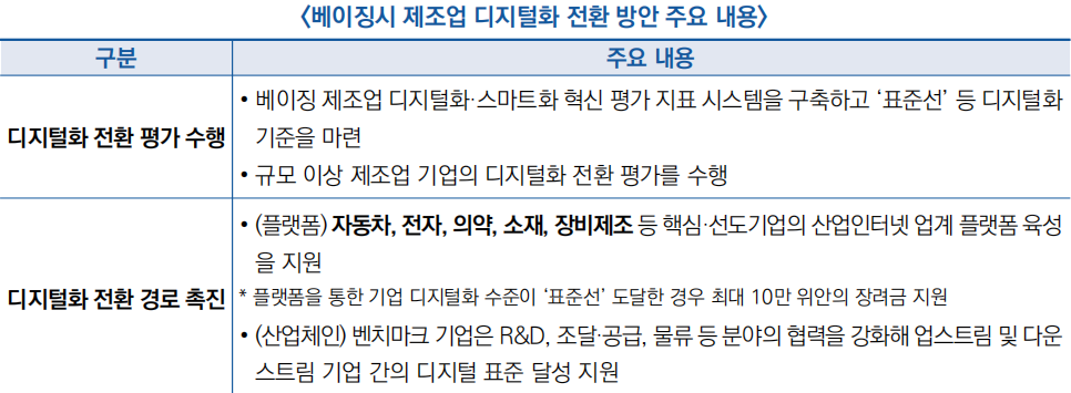 * ′21년 8월, 베이징시 경제신식화국은 ‘신지능제조100 프로젝트 실시 방안’을 발표해 베이징 디지털 공장 스마트 제도 평가 표준 체계 구축을 주요 목표로 ▷표준 홍보 및 응용 정착 가속화 ▷기업 스마트 제조능력 평가 ▷스마트 컨설팅 진단 서비스 제공 등 제조업의 지능형 전환 관련 사항을 제시