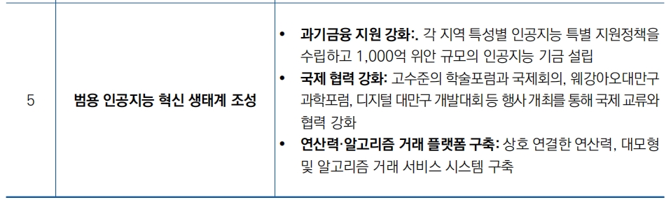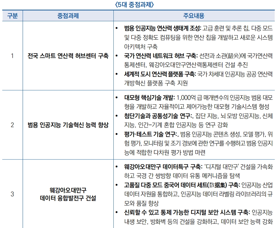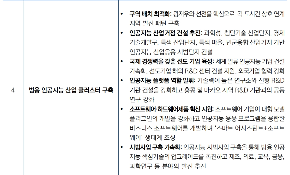 ○ 주요 내용으로 전국 스마트 연산력 허브센터 구축, 범용 인공지능 기술혁신 능력 향상, 웨강아오대만구 데이터 융합발전구 건설 등 중점과제 제시