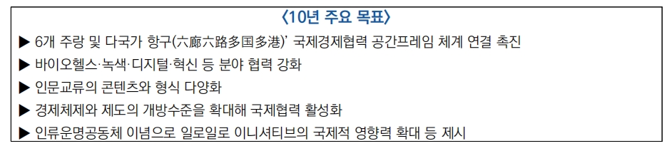 - 중국은 지난 10년간 전 세계 3/4 국가와 중요 국제조직을 아우르는 ‘일대일로’ 이니셔티브 영향권을 형성하고 상생협력의 경제무역협력 파트너관계를 구축