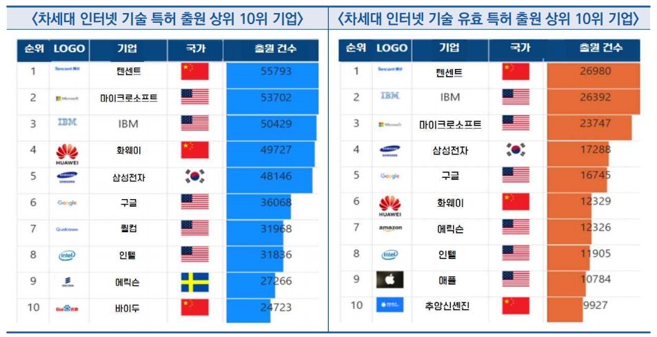 - 화웨이(49,727건), 삼성전자(48,146건), 구글(36,068건), 퀄컴(31,968건), 인텔(31,836건), 에릭슨(27,266건), 바이두(24,723건) 등 기업이 각각 7~10위 차지
