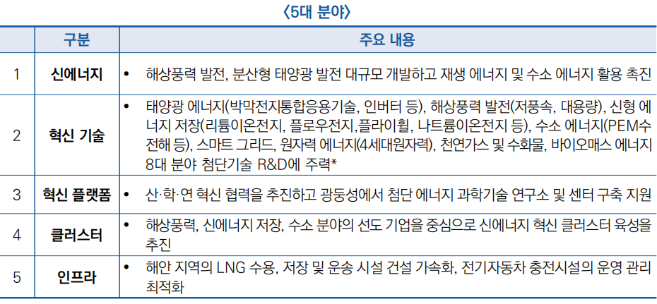 ○ 주요 과제로 신에너지 개발 및 활용 추진, 핵심기술 연구 강화, 혁신 플랫폼 구축, 산업 클러스터 육성, 에너지 인프라 건설 보완 5대 분야를 제시