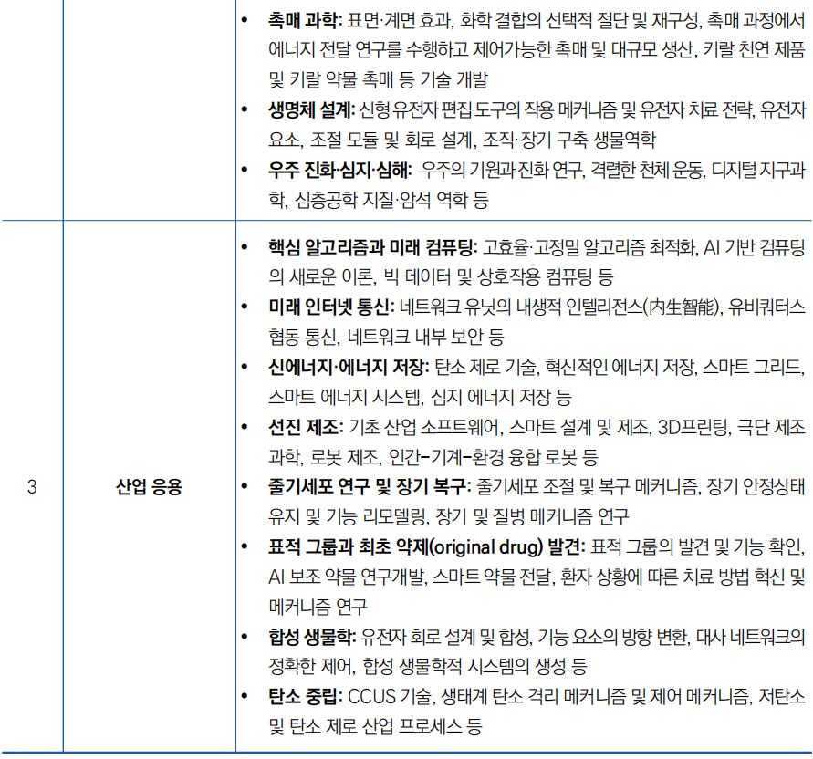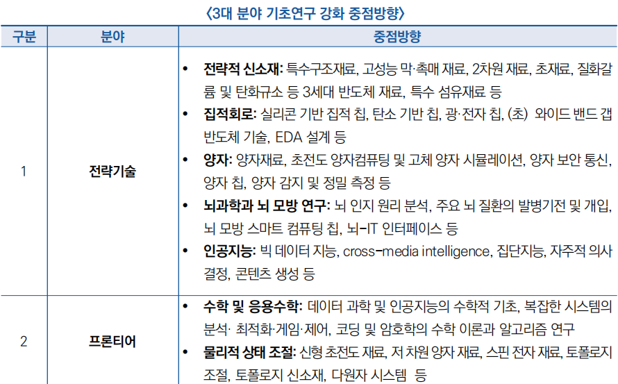 ![]() ○ 주요 내용으로 전략기술, 프론티어, 산업 응용 분야 기초연구 강화 중점방향 제시