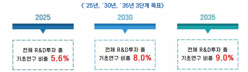 - 전체 R&D투자에서 차지하는 기초연구 비중을 ′25년부터 5년 간격으로 각각 5.6%, 8.0%, 9.0% 달성