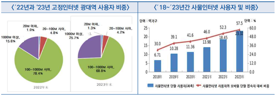 - 1000Mbps 이상 접속자 수는 1.63억 가구인데, 이중 고정 광대역 접속자 비중이 1/4 이상을 차지, 고정 광대역 접속 규모는 26만 Tbps로 전년대비 33.8% 증가