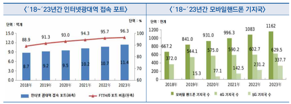 - ′23년말 기준 모바일 핸드폰 사용자 규모는 17.27억 가구이고 보급률은 122.5대/100명, 이중 5G 핸드폰 사용자 규모는 8.05억 가구로 전체의 약 1/2을 차지