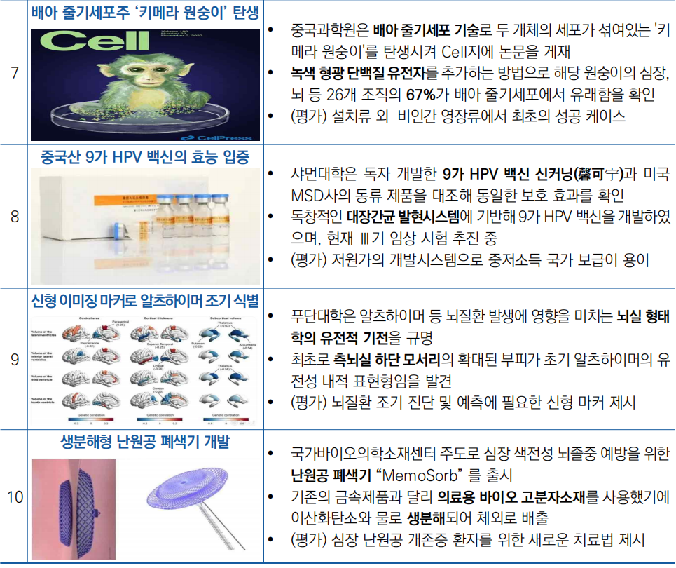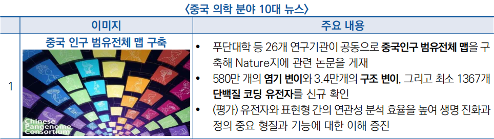 ○ 국가위생건강위원회에서 주관하는 건강보(健康报) 신문사는 ‘2023년도 중국 의학 분야 10대 뉴스’를 선정