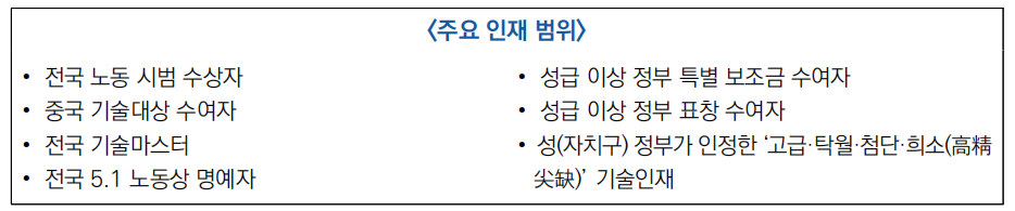 - 국가 중대 전략사업, 중대 공정, 중대 프로젝트, 중점산업에 참여한 고급 기술인재를 기술 전문가 작업장, 모범 근로자 및 장인 혁신 작업장 등에 참여