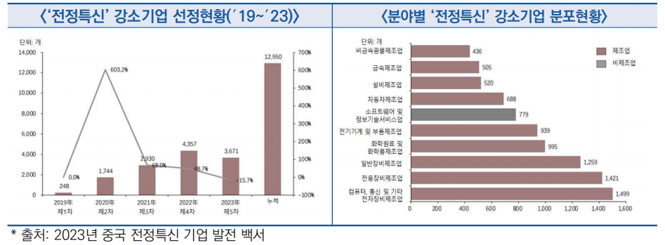 - ′19년부터 중국 정부는 5차례 총 12,950개의 ‘전정특신’ 강소기업을 선정했으며 주로 컴퓨터, 통신 및 전자장비제조업, 전용장비제조업, 일반장비제조업 등 분야에 집중