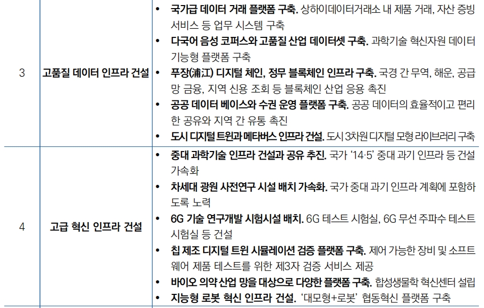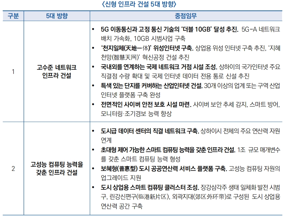 ○ 주요 내용으로 고수준 네트워크 인프라 건설, 고성능 컴퓨팅 능력을 갖춘 인프라 건설 등 5대 방향의 중점임무 제시