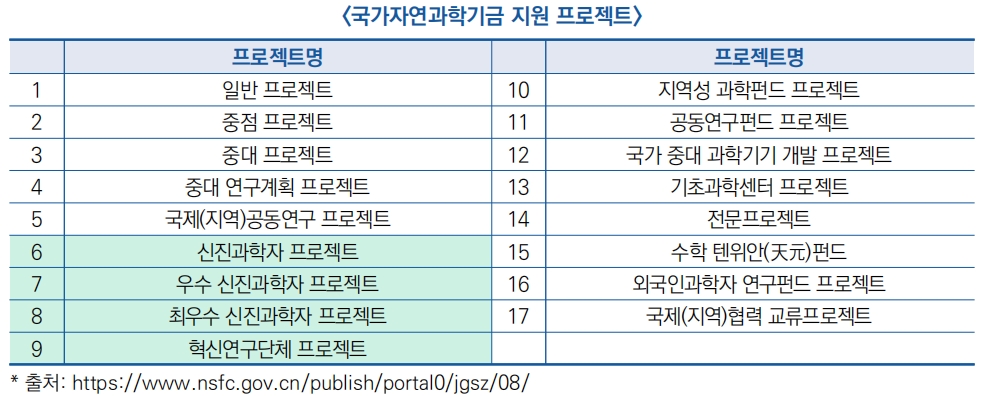 - 국가자연과학기금위는 신진과학자 지원을 위해 현재 신진과학자 프로젝트, 우수 신진과학자 프로젝트, 최우수 신진과학자 프로젝트, 혁신연구단체 프로젝트 등 추진