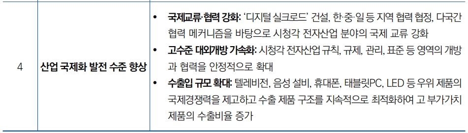 ○ 주요 내용으로 고수준 시청각 시스템 공급 능력 제고, 현대화 시청각 전자산업체계 구축, 시청각 내부순환 원활화, 산업 국제화 발전 수준 향상 등 중점임무 제시